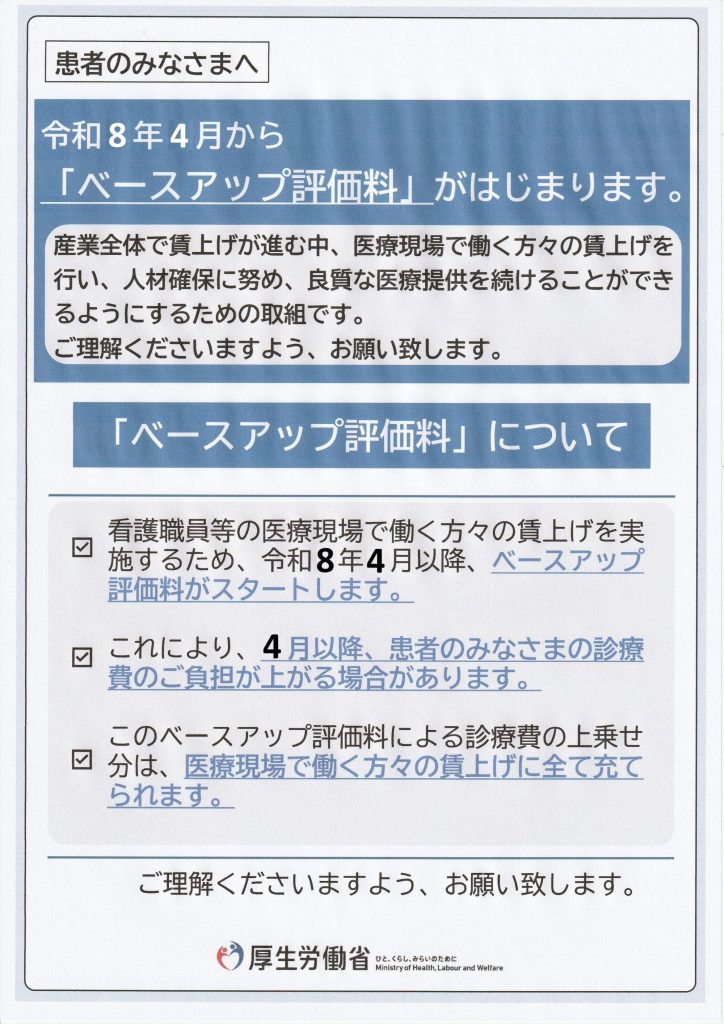 2026年3月24日 / 最終更新日時 : 2026年3月24日 kitamura clinic お知らせ ベースアップ評価料がはじまります。当院は令和8年4月よりベースアップ評価料がスタートします。患者様の診療費が上がる場合がございますが、ご理解くださいますよう、宜しくお願い申し上げます。コメントを残す コメントをキャンセルメールアドレスが公開されることはありません。 ※ が付いている欄は必須項目ですコメント ※名前 ※ メール ※ サイト 次回のコメントで使用するためブラウザーに自分の名前、メールアドレス、サイトを保存する。 Δ